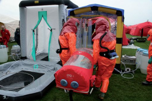 Muitas atividades humanas no setor civil podem estar associadas com a contaminação de equipamento de proteção individual, vestuário, e corpo humano com produtos químicos e agentes biológicos perigosos, ou outras substâncias nocivas. É necessário criar tais condições que garantam a descontaminação imediata e adequada e limpeza higiénica do local de acidente ou perto da área contaminada para evitar a eventual propagação no ambiente e contaminação de outras pessoas. Para eliminar os efeitos e remover as substâncias perigosas usam-se equipamentos para a descontaminação individual e coletiva. Estes incluem chuveiros de descontaminação, tendas ou outros meios de uso específico. Uma vantagem indiscutível de maioria dos produtos oferecidos é a sua concepção na forma de uma estrutura tubular inflável, que permite transferir o meio do estado de transporte para o estado disponível em dezenas de minutos, com um número mínimo de pessoas. A descontaminação é sempre realizada com um conjunto de bocais, cujo número, localização, fluxo e ângulo de dispersão são otimizados de forma a criar a menor quantidade de resíduos contaminados com a eficiência máxima do processo. Os resíduos são aspirados continuamente com exaustor especialmente construído, que mantém o nível de águas residuais inferior a 2 mm e, em conjunto com a bomba montada fora, elimina o risco de choque elétrico.